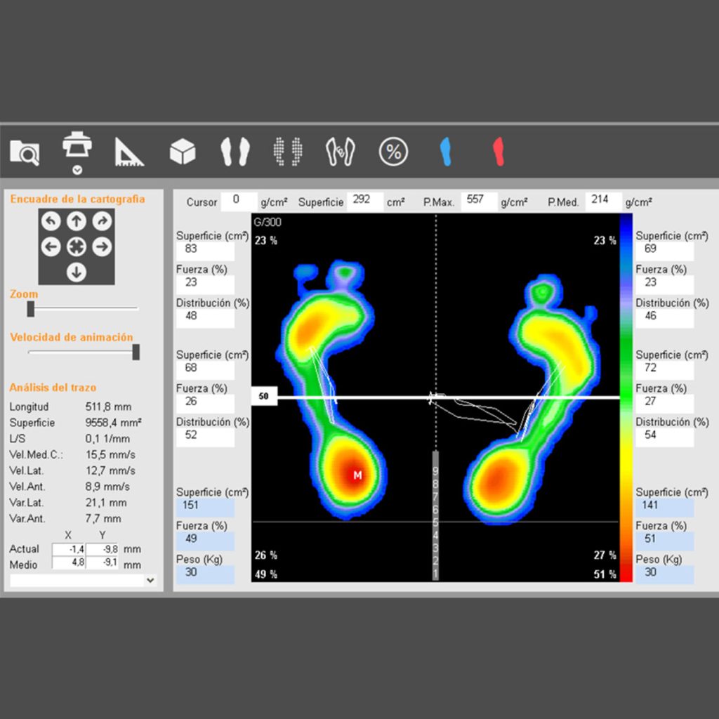 • Utilització d´una plataforma de pressions per realitzar un estudi dinàmic de l’empremta plantar, analitzant la distribució de càrregues durant el moviment, diferenciant les etapes de primer contacte, carrega total i impuls del peu.